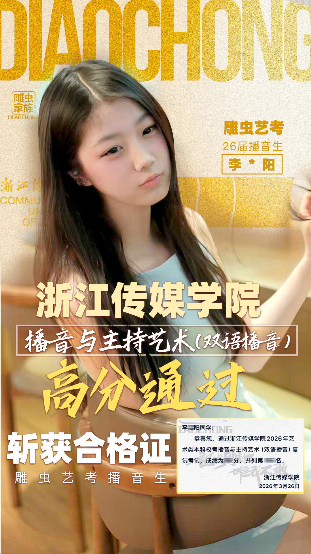 雕虫26届播音生,浙江传媒学院播音与主持艺术(双语播音)高分通过,斩获全国小圈合格证!